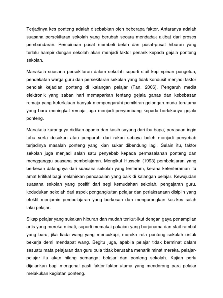 Pelajar-pelajar pula perlu memillh kawan yang baik. FAKTOR-FAKTOR PENYEBAB PONTENG Terjadinya kes ponteng adalah disebabkan oleh beberapa fakor. Ponteng sekolah merupakan satu perbuatan yang menyalahi peraturan sekolah.